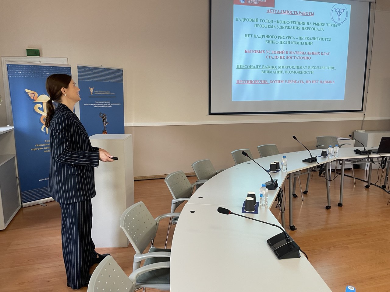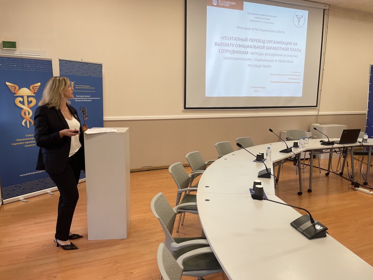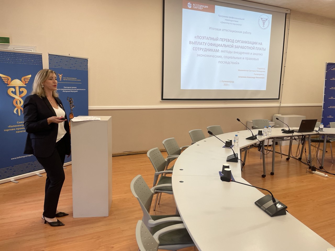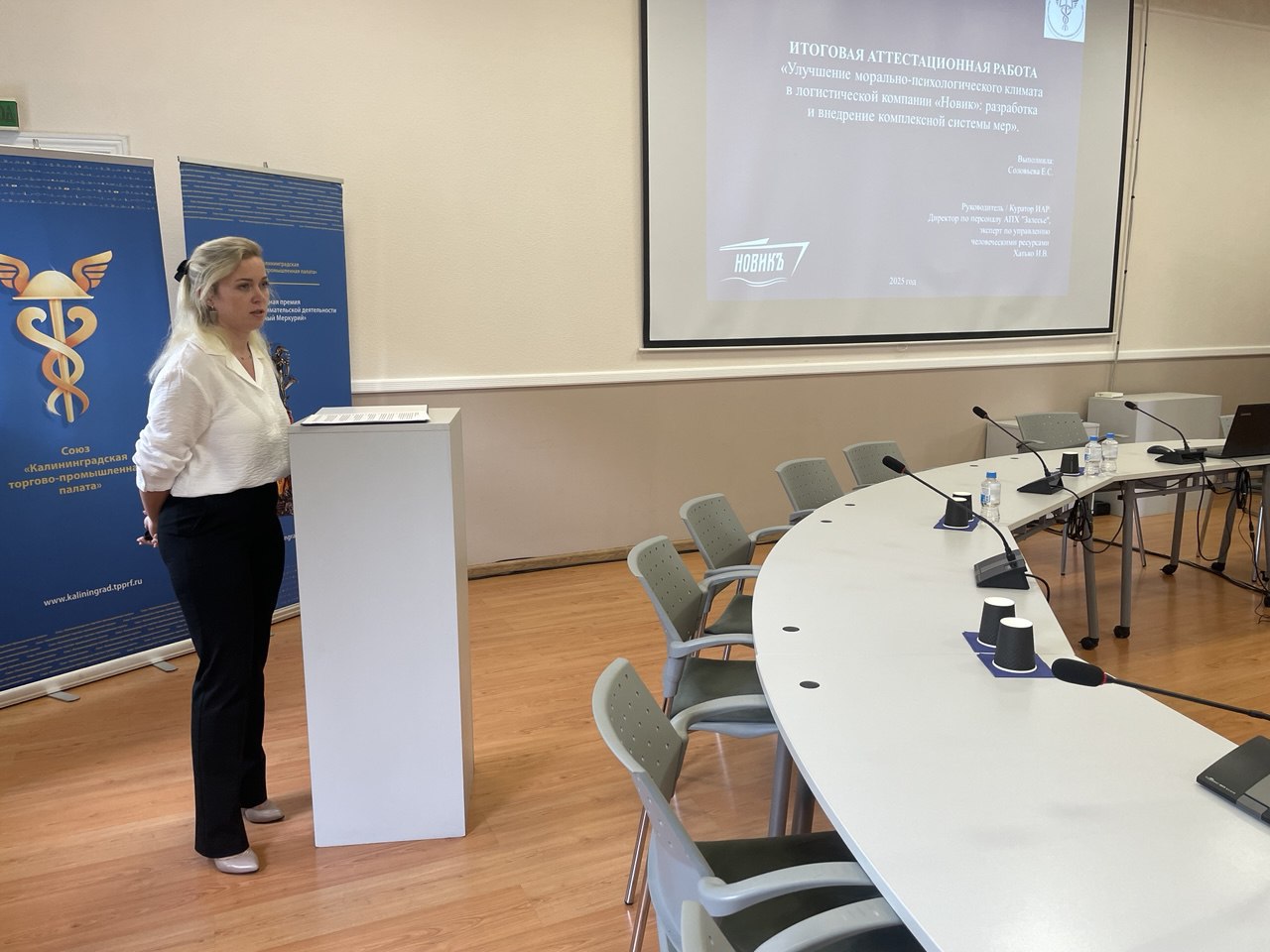 Программа разработана и проведена при поддержке экспертов ассоциации «HR-партнёр». Выпускники программы топ-менеджеры компаний: ООО «Потенциал»(аутсорсинг персонала), ГК «Новик», ОКБ «Факел», компании «Грюнвальд», ГК «Океан» («Вичи-Русь»), ТД «Строитель», ОАО «Автотор», агентства недвижимости «Эволюция», Проектной судоремонтной компании, крюинговой компании «Стафф Марин», страховой компании «Гайде», частной школы «Базис», ГК «Мельниково-Продукт», АО «Молоко». На итоговой аттестации - защите были представлены проектные работы по заказу работодателей и владельцев компаний, в которых работают слушатели, все они получили положительные рецензии заказчиков и приняты к внедрению в организациях.